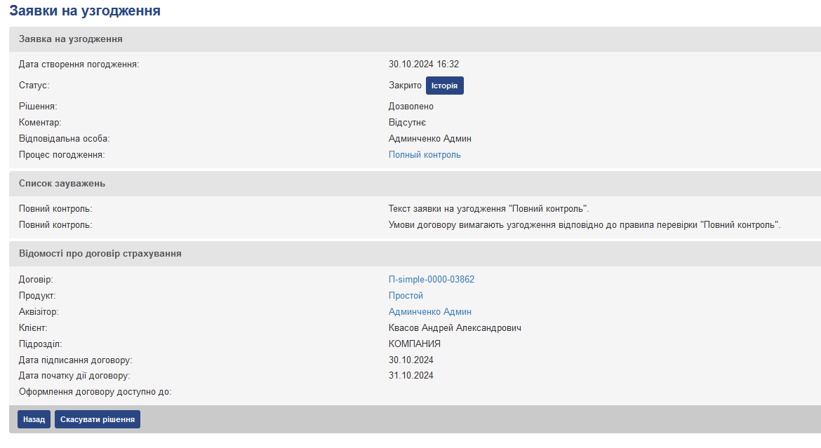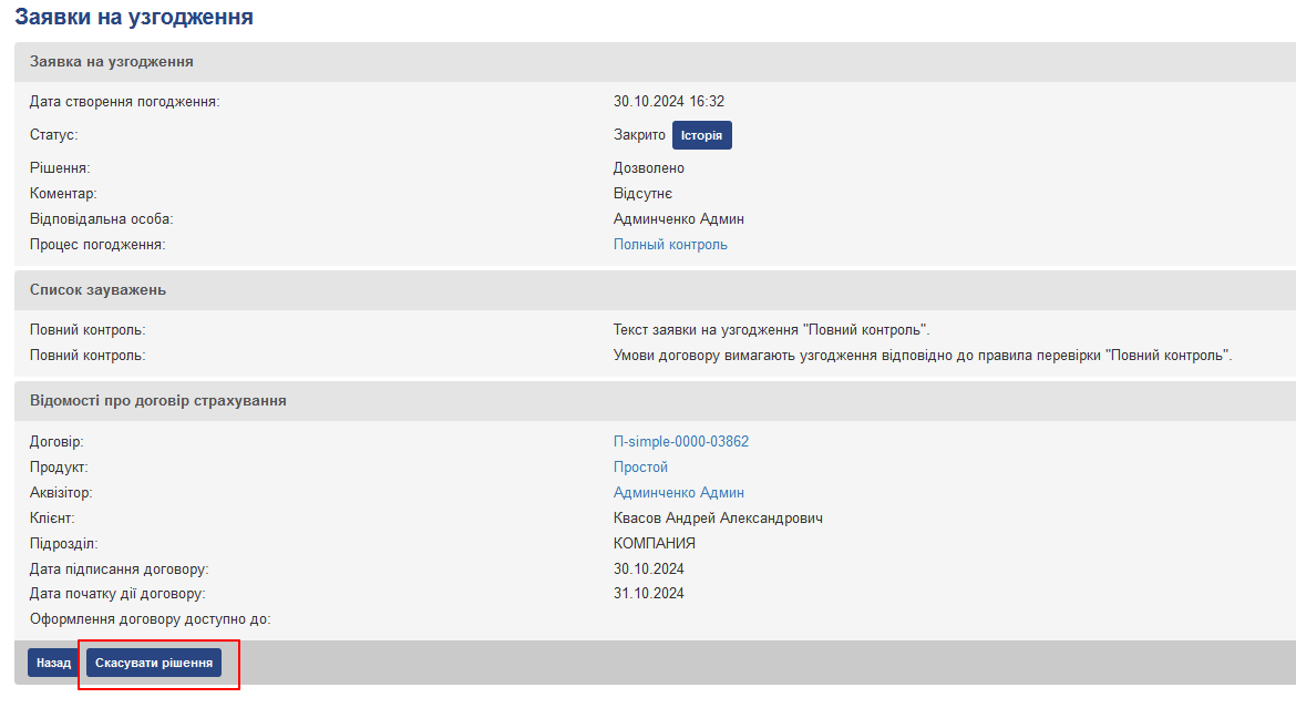Якщо користувач помилково погодив зауваження андеррайтингу, то при наявності відповідної привілеї дане рішення можна скасувати, натиснувши кнопку “Скасувати рішення”.