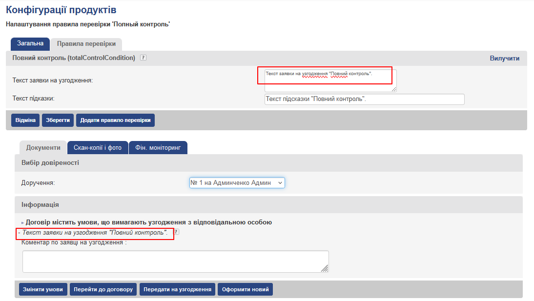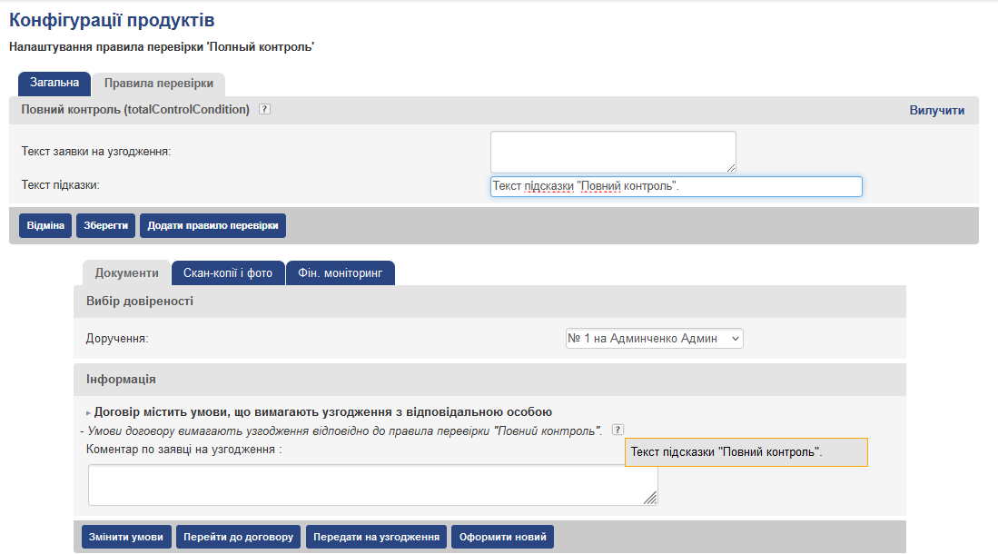 Критерії виявлення нестандартних умов в договорі налаштовуються окремо для кожної конфігурації продукту, а також для тарифних планів у вигляді так званих “правил перевірки”. Налаштовувати правила перевірки мають право користувачі з роллю Суперкористувач, Адміністратор узгодження.