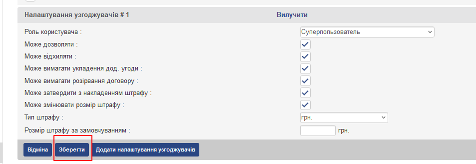 - Розмір штрафу за замовчуванням – в даному полі можна задати розмір штрафу, який буде призначатися автоматично при накладенні штрафу при перевірці договору по даному процесу узгодження.