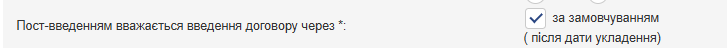 Якщо настройка, виконана в конфігурації продукту, повинна застосовуватися в договорах за замовчуванням із застосуванням конкретного тарифного плану, то слід перейти на сторінку перегляду тарифного плану та на закладці “Загальні дані” в поле “Пост-введенням вважається введення договору через” встановити прапор в поле “за замовчуванням” (див. рис.). В даному випадку в тарифному плані буде відзначено в дужках, що значення береться з конфігурації продукту.