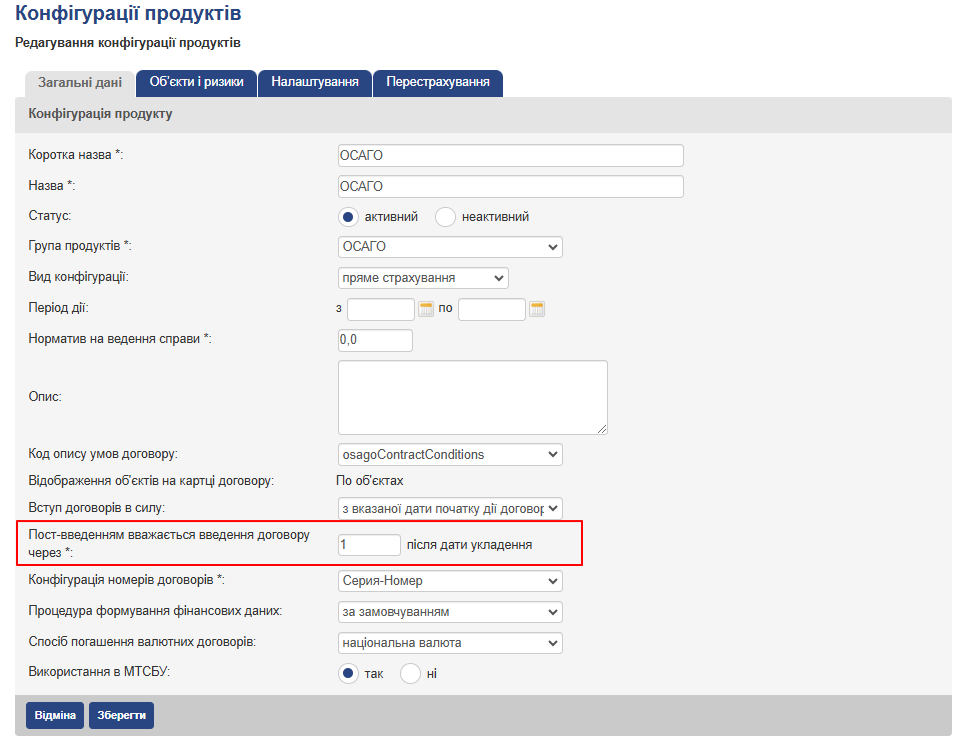 Для виконання налаштування слід перейти на сторінку перегляду конфігурації продукту і в режимі редагування на закладці “Загальні дані” в поле “Пост-введенням вважається введення договору через ___ після дати укладення” вказати кількість днів, через які після укладання договору буде йти на пост-перевірку , а не на андеррайтинг (див. рис.). Налагоджена в конфігурації продукту дане значення може потім застосовуватися в тарифному плані як за замовчуванням, так і бути довизначити.