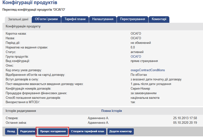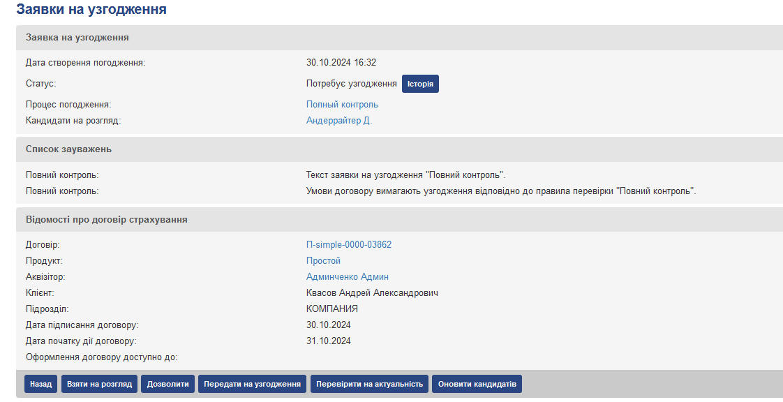 Метою процесу андеррайтингу є виявлення договорів з нестандартними умовами і узгодження цих умов з відповідальними особами до безпосереднього укладання договору страхування. При андеррайтинг виконується блокування оформлення договору до отримання підтвердження від відповідальних осіб по кожному зауваженню. Договір зберігається в статусі “Пропозиція”, а після передачі на погодження (після натискання кнопки “Передати на узгодження” на сторінці друку договору) перейде в статус “На погодженні”. У разі успішного узгодження всіх зауважень договір перейде в статус “акцептувати”, а в разі отримання відмови у підтвердженні хоча б одного зауваження – в статус “Відхилено”. Укладення договору можливо тільки після повного його узгодження по всіх зауважень, і при укладанні договору перейде зі статусу “акцептувати” в статус “Укладено”.