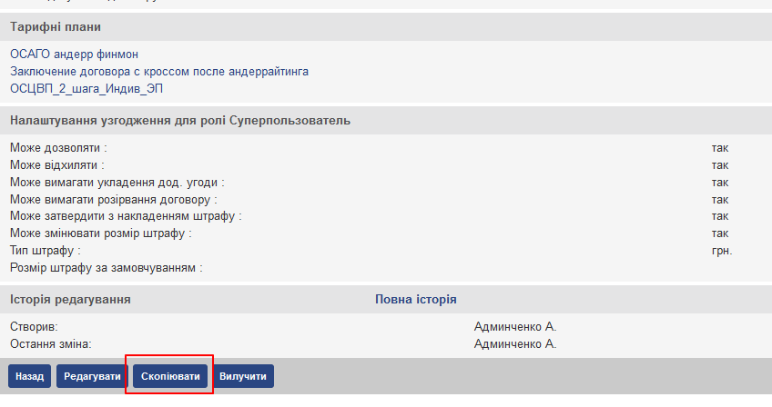 Для створення нового процесу узгодження на основі вже налаштованого слід перейти на сторінку детального перегляду налаштованого і натиснути у функціональному меню кнопку “Копіювати”.