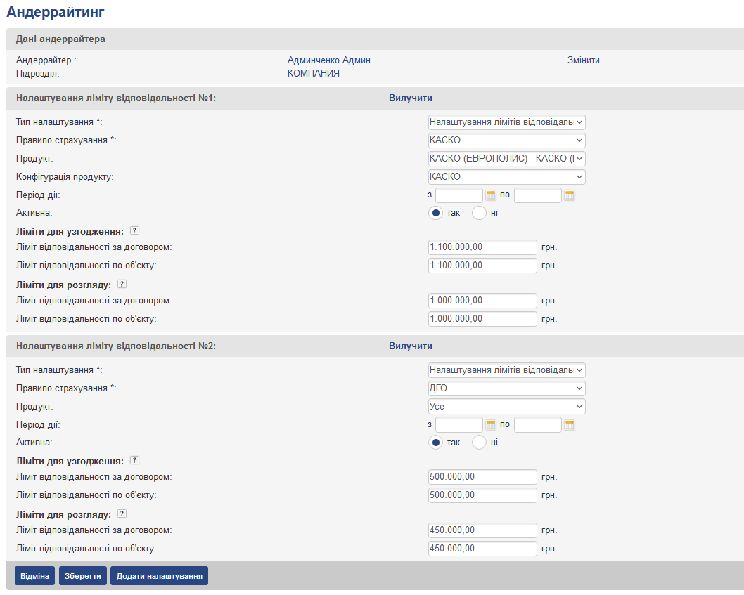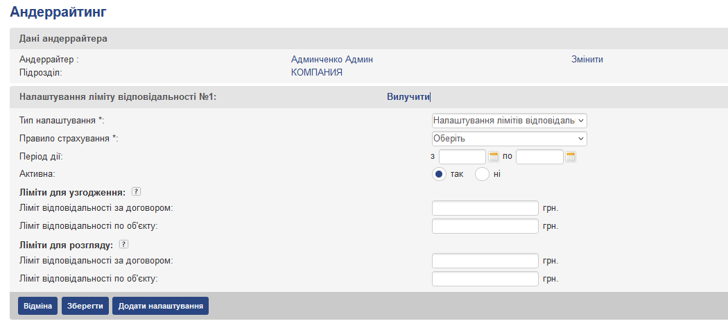 Для Андеррайтера можуть бути налаштовані два ліміту – перший – при якому значенні ліміту йому будуть приходити зауваження – ліміт для розгляду (за замовчуванням в цей блок копіюються значення з блоку “Ліміт для узгодження”), і другий – при якому він може акцептувати зауваження – ліміт для узгодження.