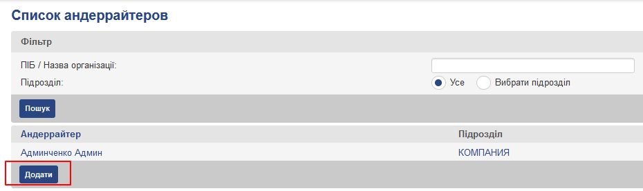 Після збереження даний андеррайтер відобразиться в списку андеррайтерів, де відображається його ім’я і підрозділ, до якого він належить. Також, в списку можна переглянути настройки та інших андеррайтерів, для цього слід натиснути на його імені в списку (при натисканні в списку на назву підрозділу андеррайтера, здійсниться перехід на сторінку перегляду даних підрозділу).