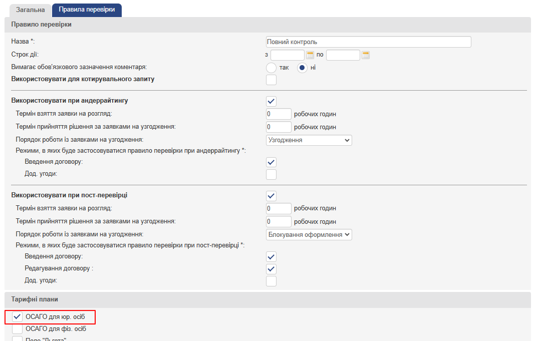 - Ознака, чи використовувати дане правило при андеррайтингу (слід встановити прапор при необхідності використовувати), а також режими, в яких буде застосовуватися правило перевірки при андеррайтингу