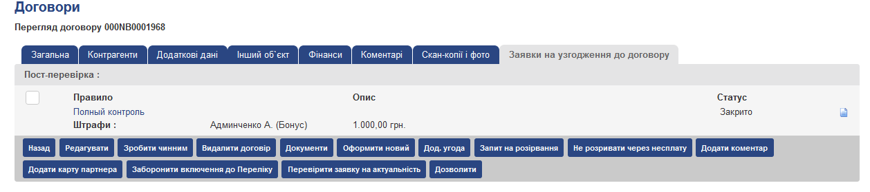 Якщо після зміни умов договору, буде необхідно їх також узгодити, то після передачі договору на узгодження (докладніше див. Розділ Правила перевірки і умови їх спрацьовування) в ньому додадуться нові зауваження, а попередні умови залишаться в колишньому статусі ( “Дозволено”, “Відхилено “,” Затверджено з накладенням штрафу “). Після зміни умов договір повернеться в статус “Пропозиція”, а після повторної передачі на погодження – знову перейде в статус “На погодженні”.