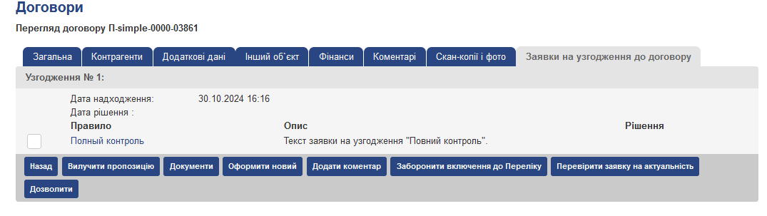 Примітка: кнопки “Дозволити”, “Взяти на розгляд”, “Оновити кандидатів” відображаються в функціональному меню після установки прапорів біля договорів в списку зауважень. Після дозволу укладення договору без прийняття на розгляд статус зауваження “Без узгоджувача” або “Потребує узгодження” відразу зміниться на “Закрито” без проходження статусу “На погодженні”.