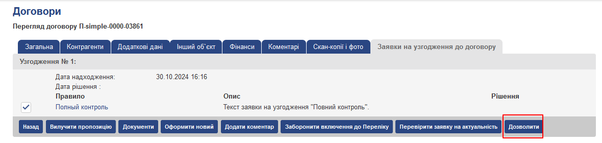 - “Дозволити” – після натискання на цю кнопку можливо дати дозвіл на укладення договору без попереднього прийняття на розгляд даного зауваження (докладніше див. Далі)