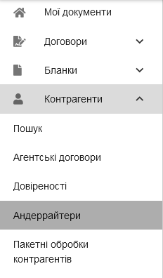 Для настройки правила перевірки лімітів відповідальності за договорами в системі BO створений окремий модуль “Андеррайтери” (перехід в навігаційному меню “Контрагенти – Андеррайтери”), в якому можна вказати андеррайтерів, що мають права на узгодження договорів з перевищеними лімітами.