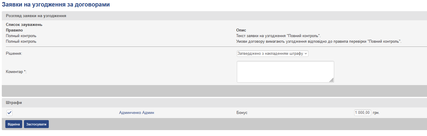 - На закладці “Зауваження до договору” – на даній закладці відображається інформація по кожному яке з’явилося правилом перевірки: назва правила, опис правила, прийняте рішення за правилом. У разі прийняття рішення за правилом “Затверджено з накладенням штрафу” додатково відобразиться рядок “Штрафи”, в якій буде вказано оштрафовані, тип КВ і розмір штрафу (див. Рис.)